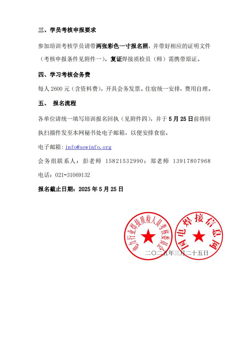 根据国家能源局新颁布的《DL/T869火力发电厂焊接技术规程》中“参加焊接工程验收人员应参加专门技术培训,具备相应的质量管理知识,并取得相应的资格证书”的规定,为有效实施国家能源局《DL/T5210.5-2018电力建设施工质量验收规程》,帮助电力施工单位、发电厂、监理单位、焊接技术人员全面理解新规程,有序开展火电建设工程焊接质量的检查验收评定,国电焊接信息网携手电力行业质检人员考委会于2025年6月15日-6月22日在宁波市举办2025年第一期(总第64期)电力焊接质检人员(含金属试验室各类人员)培训研讨会,现将本次研讨会的有关事项及要求通知如下: